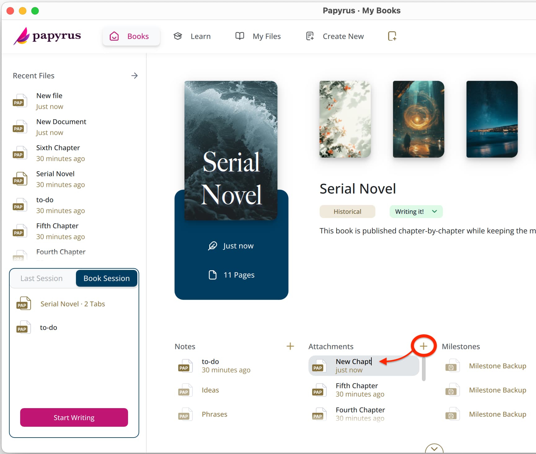 Start a Papyrus project for your book. You’ll get a folder in your mac’s “documents” folder with the main book file, its backups and other Papyrus-specific files.